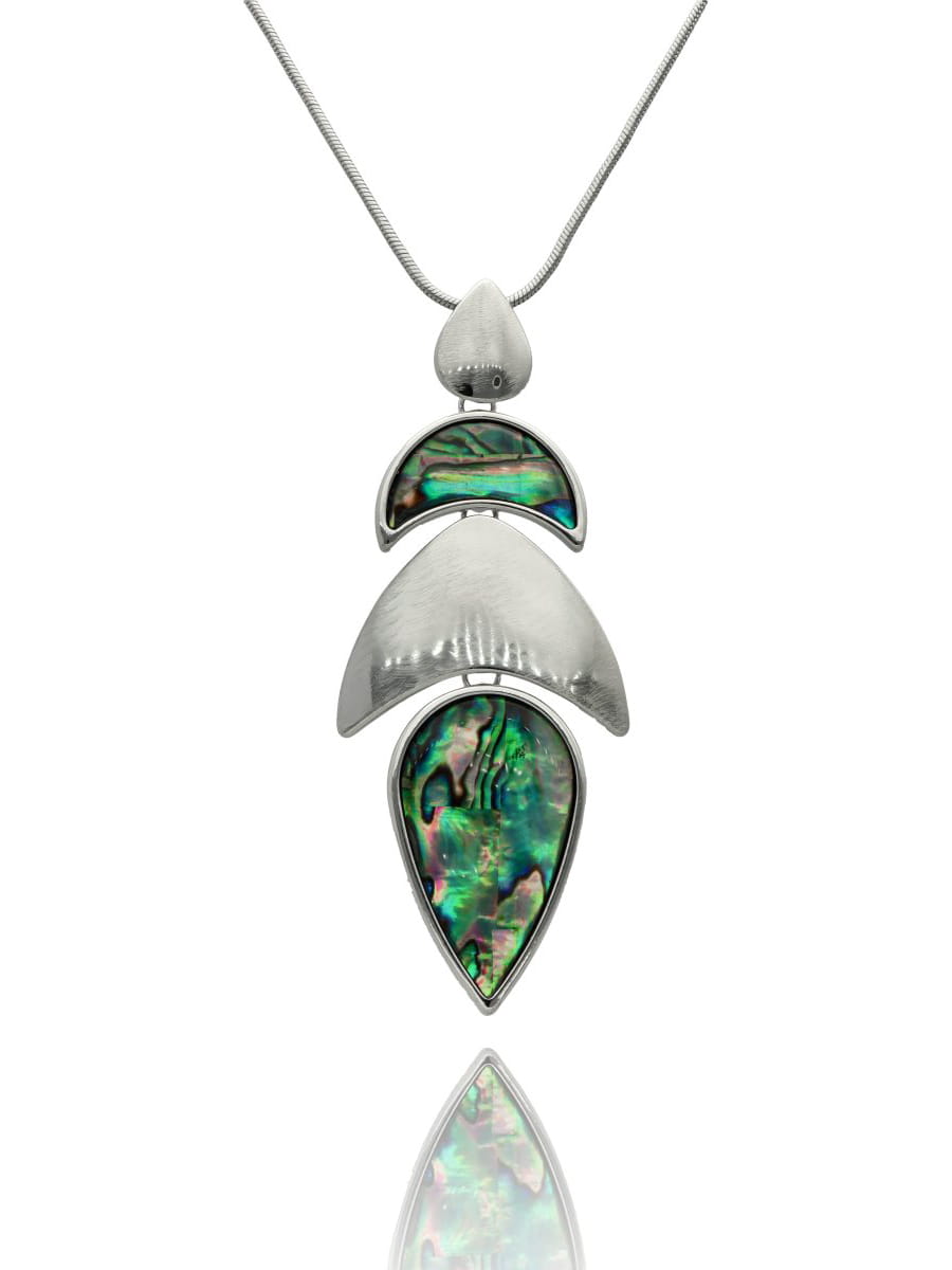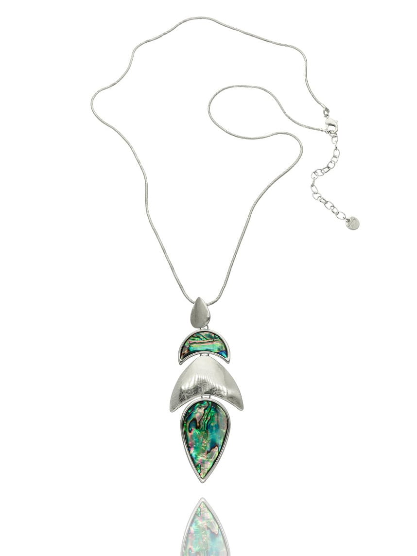 Łzy Oceanu – naszyjnik, który zachwyca elegancką formą inspirowaną naturą. Jego unikalna, trójwarstwowa zawieszka przypomina krople morskiej fali, a lśniąca muszla Abalone mieni się hipnotyzującymi odcieniami błękitu i zieleni, przywodząc na myśl tajemnicze głębiny oceanu. Matowe, srebrzyste wykończenie antyalergicznego metalu dodaje biżuterii nowoczesnego, szlachetnego charakteru. Długi łańcuszek (70 cm + regulacja) optycznie wysmukla sylwetkę, czyniąc naszyjnik idealnym dodatkiem do eleganckich i artystycznych stylizacji. Łzy Oceanu to wyjątkowa biżuteria dla kobiet, które cenią wyrafinowany styl i naturalne piękno.