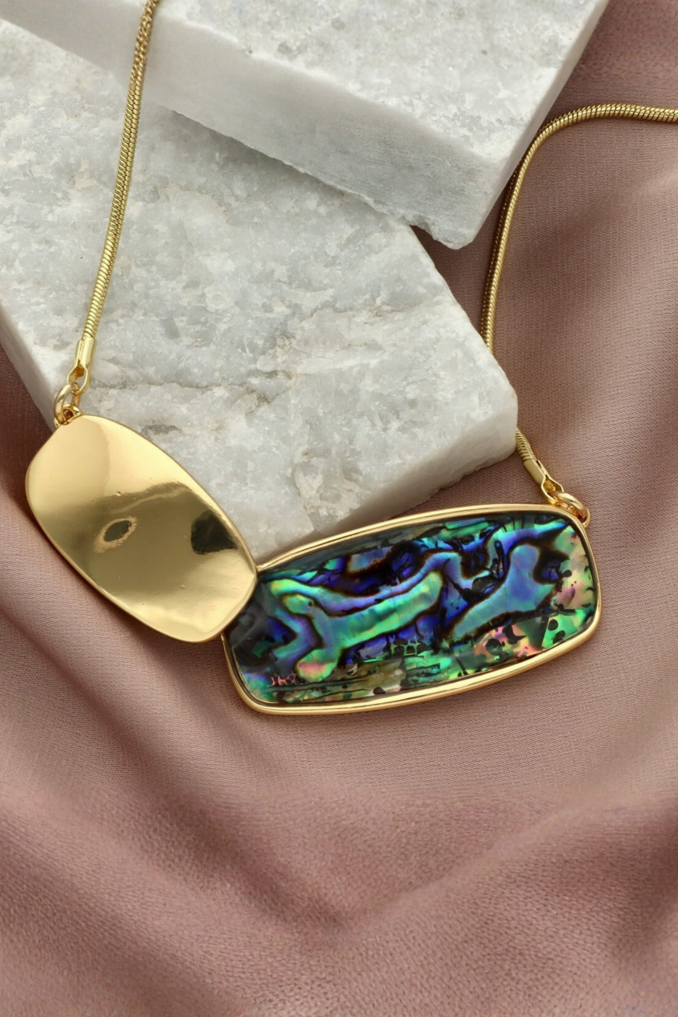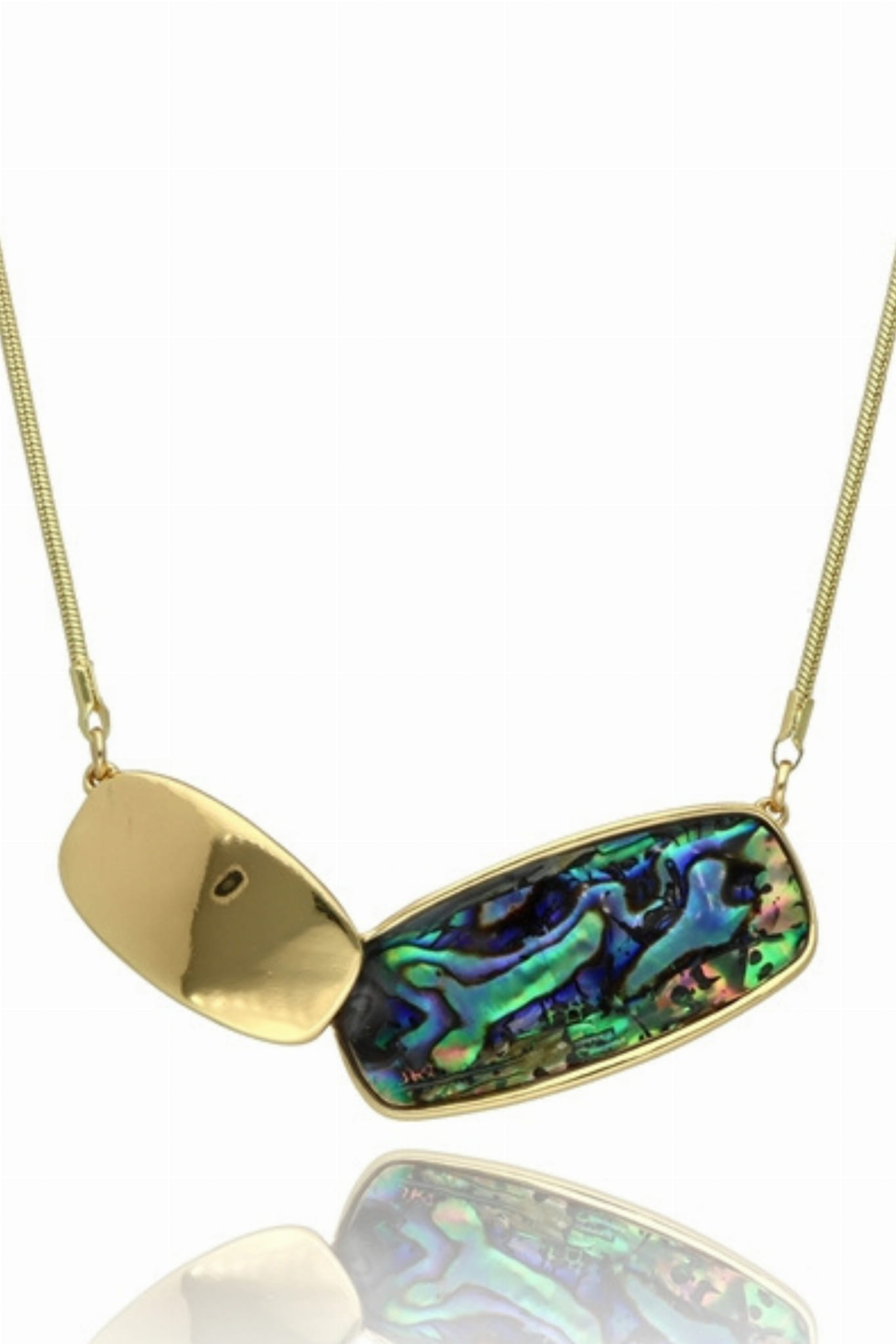 Wyjątkowy naszyjnik, który przyciąga wzrok i hipnotyzuje grą barw. Krótka forma pięknie układa się w dekolcie, a asymetryczna zawieszka z naturalnej muszli mieni się głębią zieleni, turkusu i fioletów, przywodząc na myśl ruch oceanu i energię natury. Połączenie organicznego kształtu z nowoczesnym designem tworzy biżuterię idealną dla kobiet ceniących oryginalność i styl.