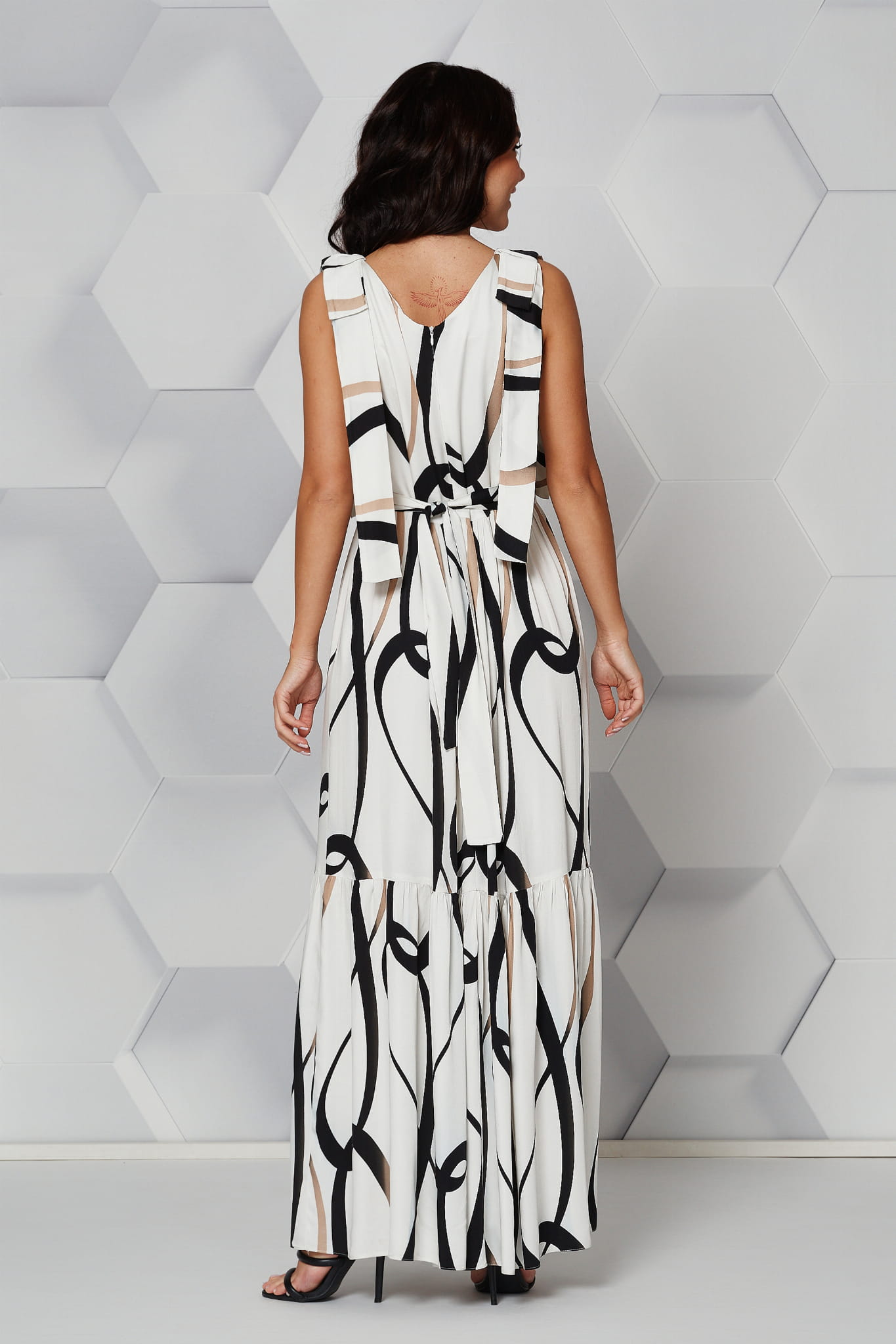Ta długa sukienka świetnie sprawdzi się podczas letnich wieczorów, rodzinnych spotkań czy wakacji w ciepłej scenerii. Szerokie ramiączka z efektownymi kokardami nadają sukience charakteru. Linet maxi to model, który bez wysiłku podkreśli Twój indywidualny styl, jednocześnie zapewniając swobodę ruchu.