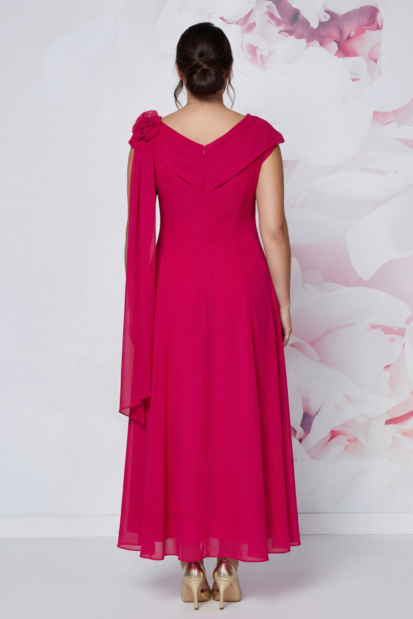 Fason sukni zachwyca lekkością i finezją. Wykonana z delikatnego, zwiewnego szyfonu, suknia Amalfi pięknie pracuje przy każdym kroku, tworząc wokół sylwetki eteryczną aurę. Najbardziej charakterystycznym elementem jest efektowny, drapowany dekolt typu "woda", który płynnie przechodzi w ozdobny szal opadający na jedno ramię. To rozwiązanie dodaje stylizacji szczyptę tajemniczości i zwiewności.