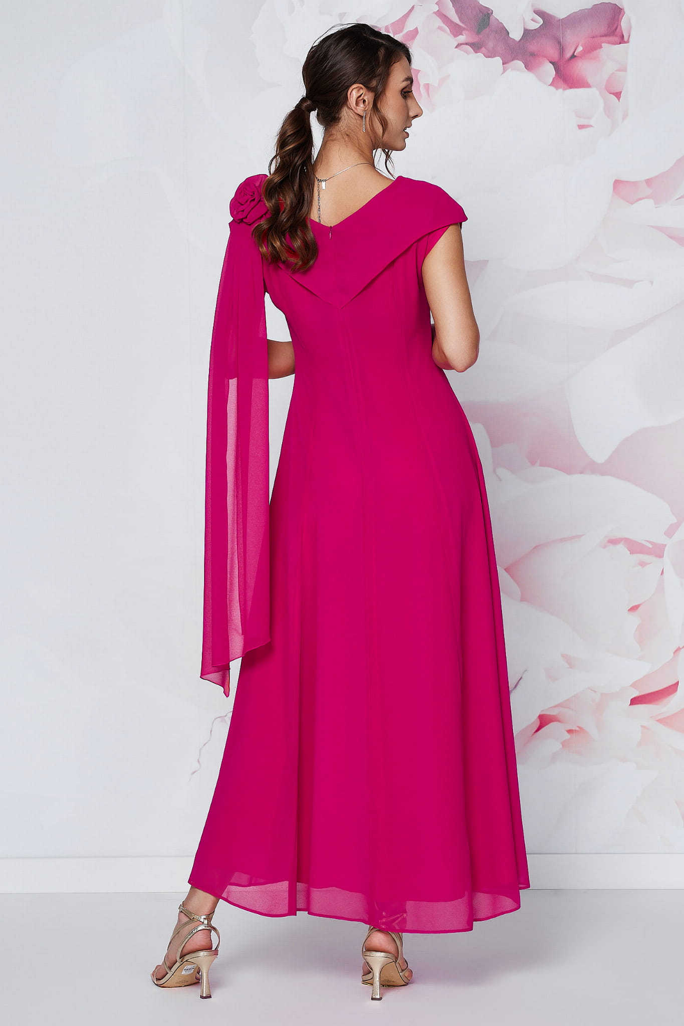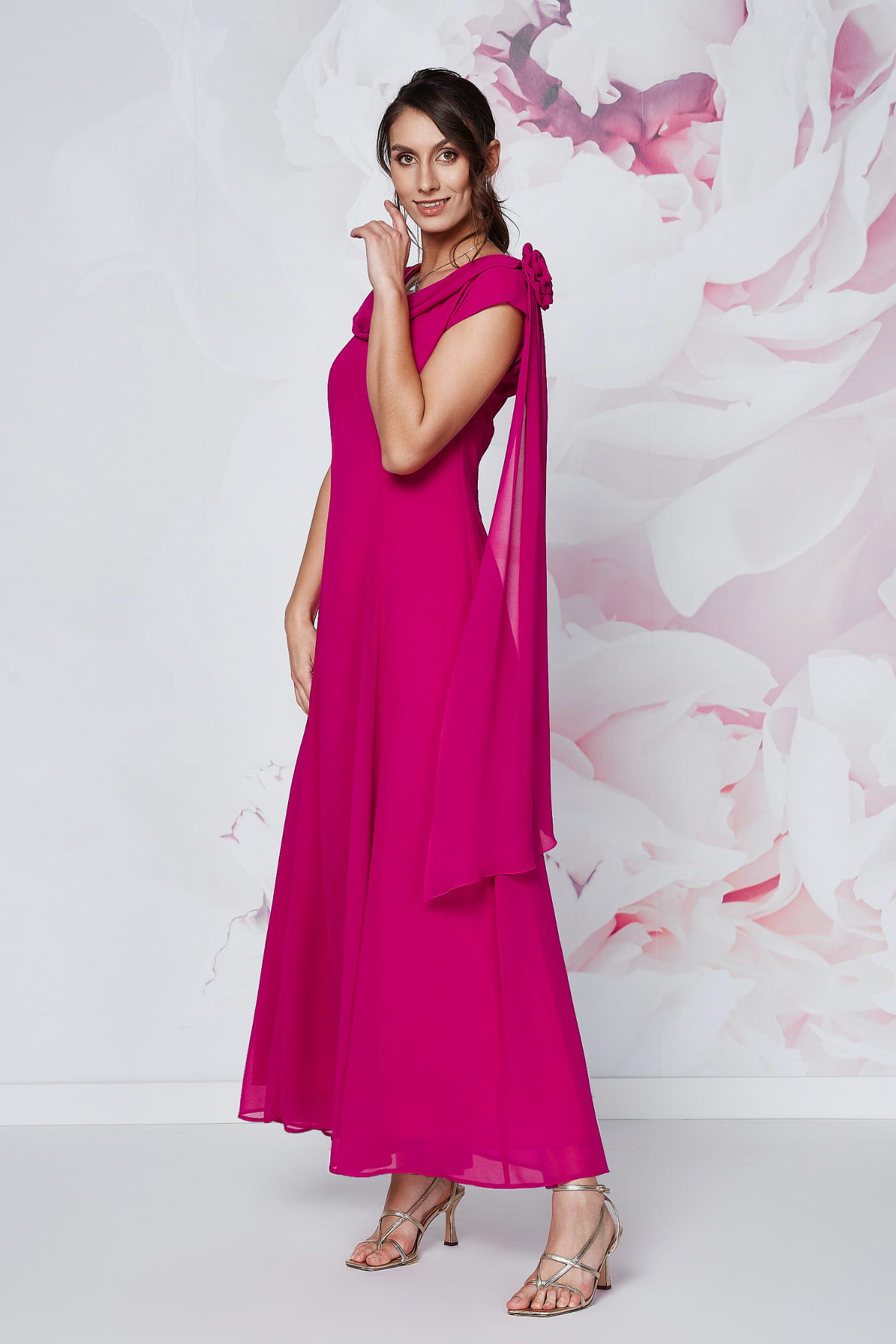 Suknia Amalfi w odcieniu fuksji to propozycja idealna dla każdego typu karnacji – od porcelanowej po mocno opaloną. Fason ten jest szczególnie polecany dla sylwetek typu klepsydra, gruszka, ponieważ asymetryczne zdobienie na ramieniu i rozkloszowany dół doskonale balansują proporcje ciała.