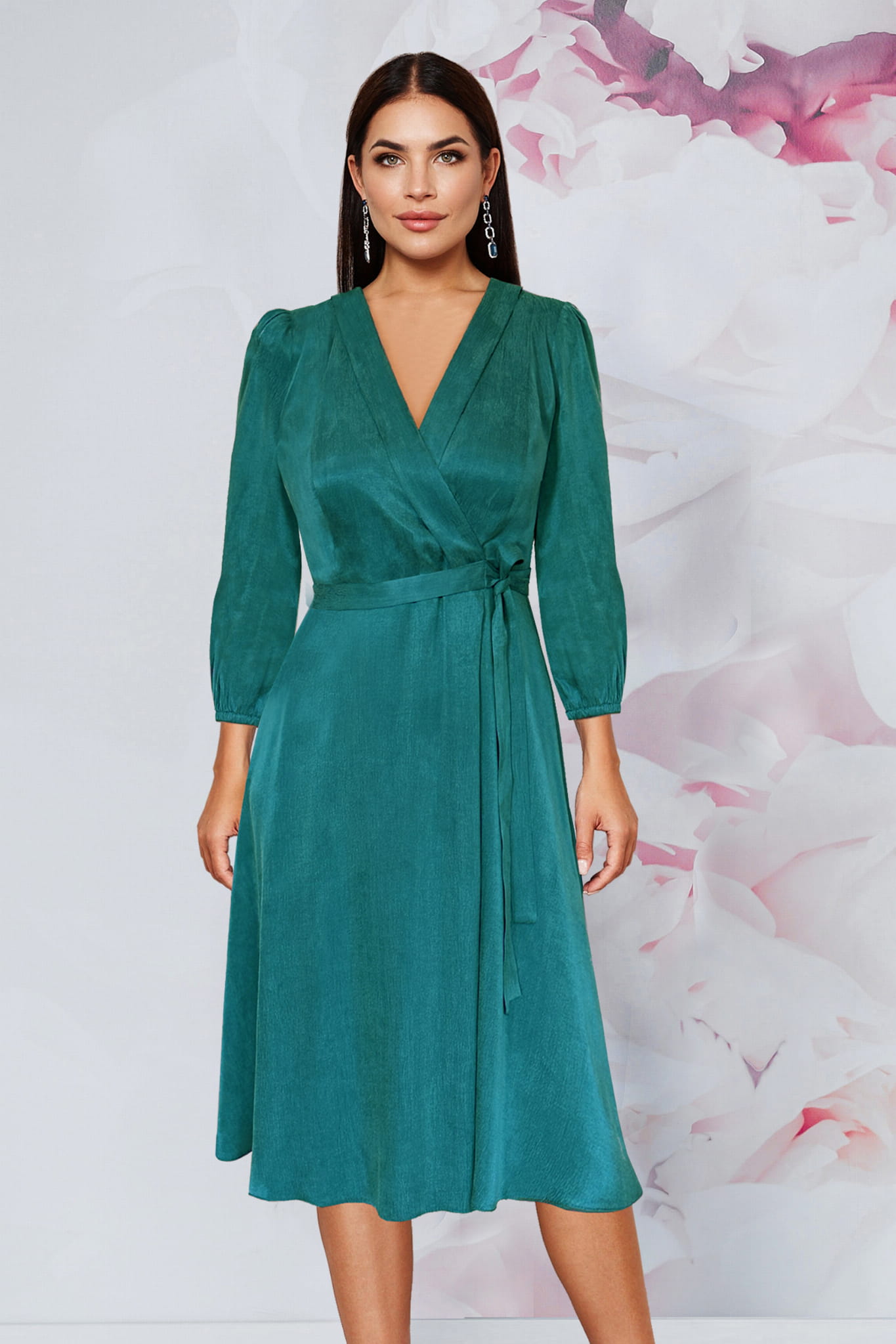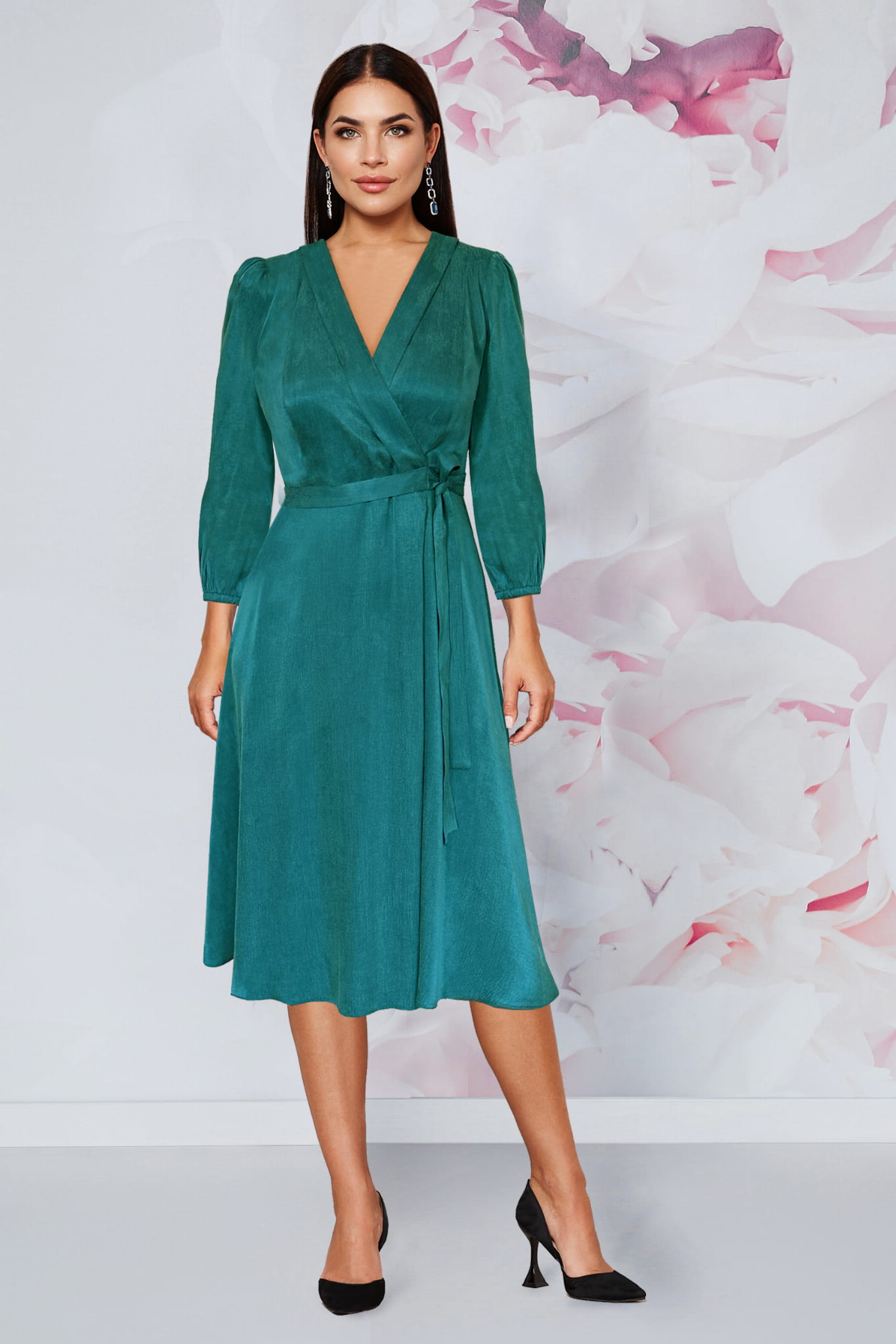 Dzięki starannie dopasowanej długości do połowy łydki, sukienka ta optycznie wydłuża nogi, a dekolt w kształcie litery V dodaje stylizacji lekkości i subtelnie eksponuje szyję. Rękawy o długości 3/4, zakończone delikatną bufką, to detal, który nadaje całości romantycznego charakteru. Sukienka Alania została stworzona, byś czuła się w niej swobodnie i zmysłowo, niezależnie od sytuacji. Jest to idealna propozycja dla kobiet o figurze klepsydry, prostokąta, a także gruszki, ponieważ kopertowy krój sprytnie maskuje ewentualne mankamenty, a wiązanie w pasie pozwala na perfekcyjne dopasowanie do talii.