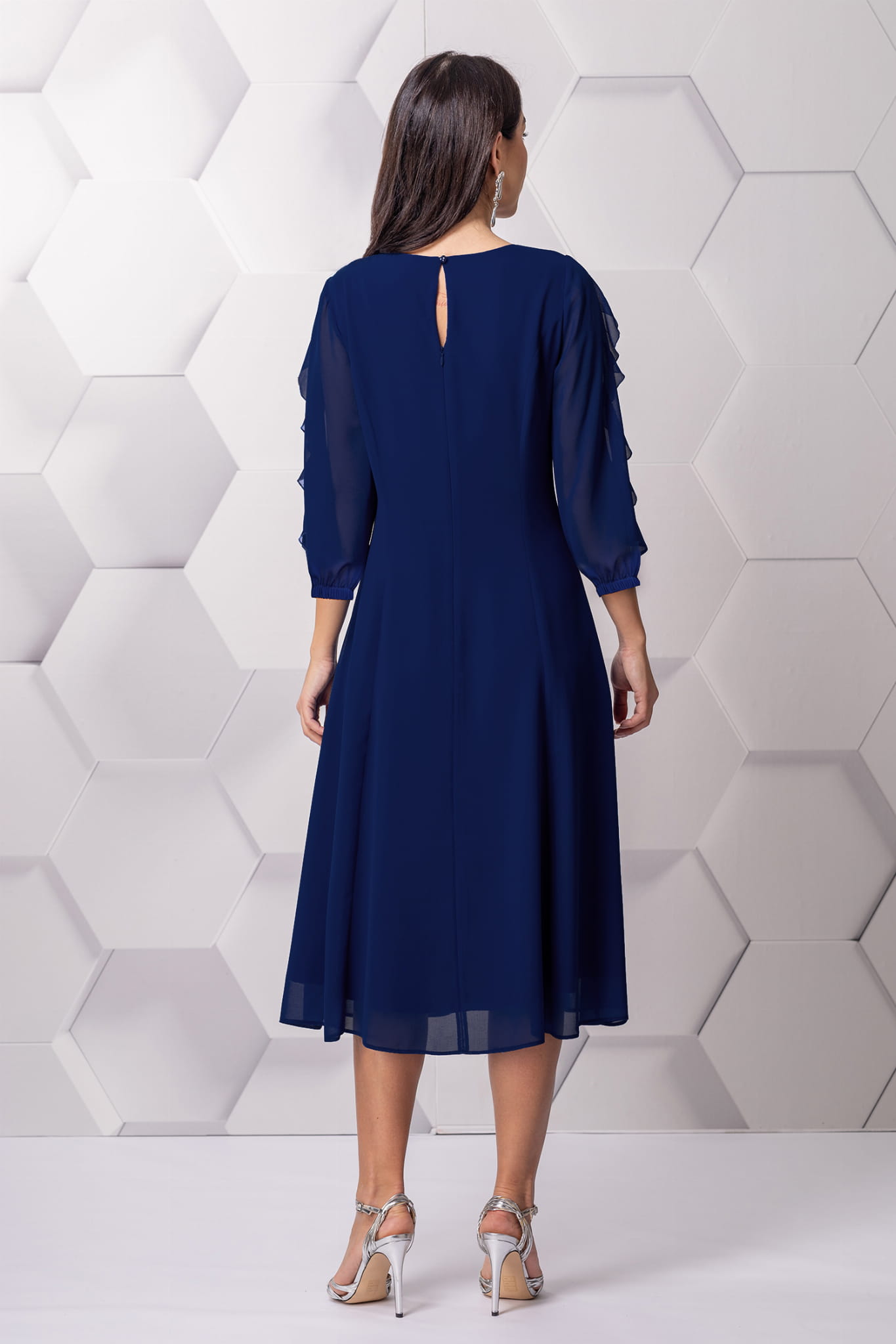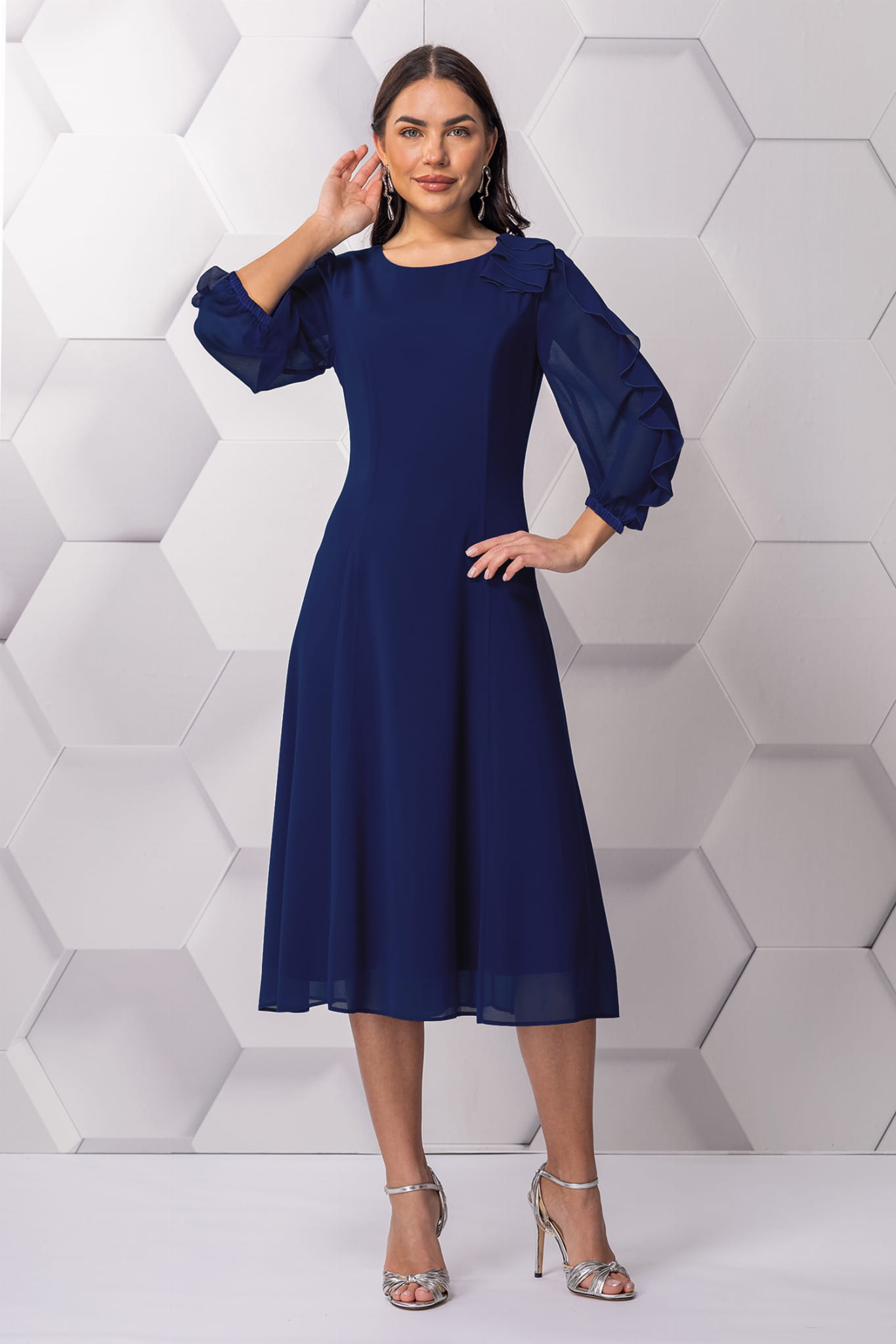 Sukienka Amaris w głębokim odcieniu granatu to kwintesencja klasycznej elegancji i wyrafinowanego stylu. Jej rozkloszowany fason o długości midi pięknie podkreśla sylwetkę, nadając jej lekkości i harmonii. Ten model to doskonały wybór dla kobiet ceniących eleganckie, a jednocześnie wygodne stylizacje na wyjątkowe okazje – od wesel po rodzinne uroczystości.