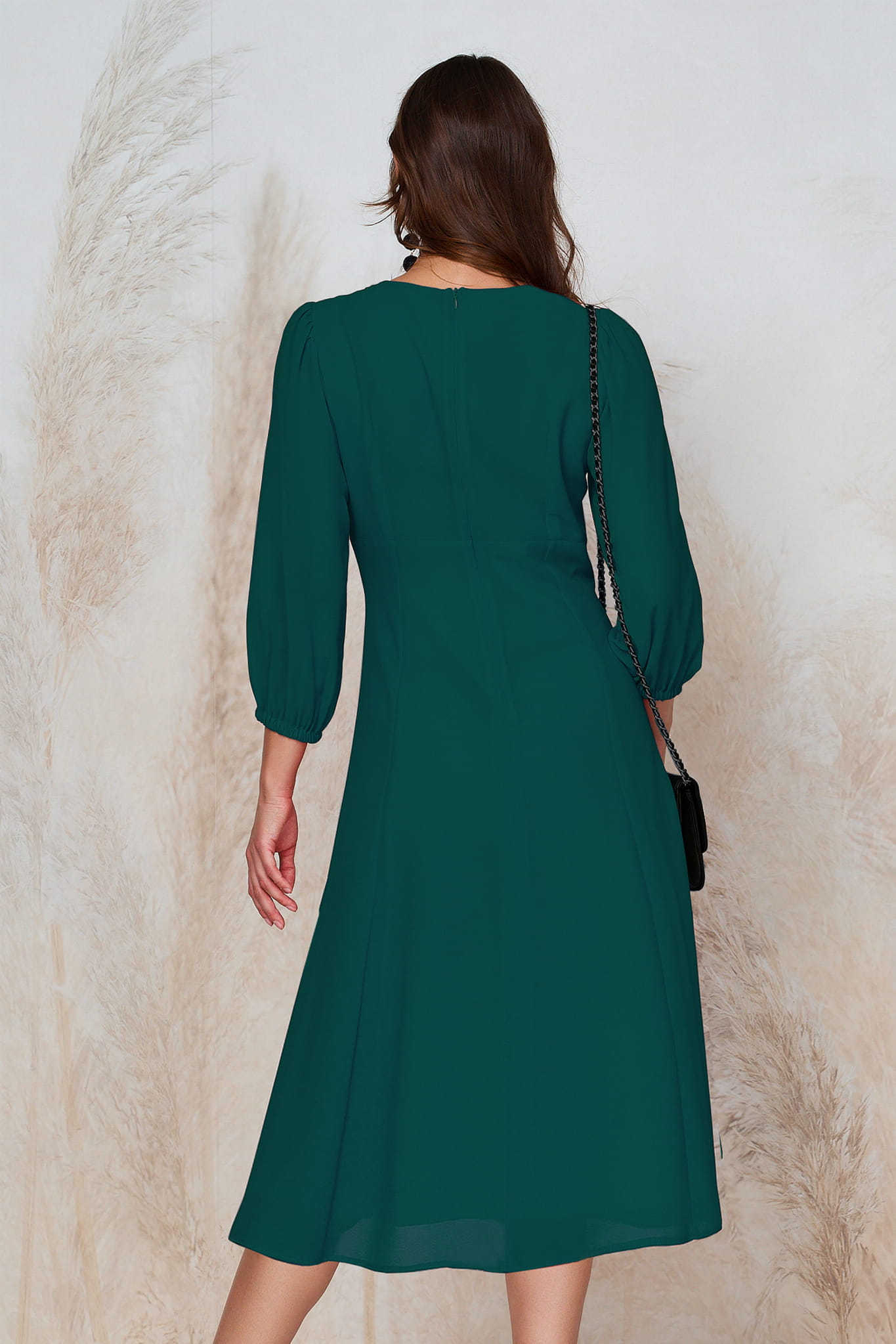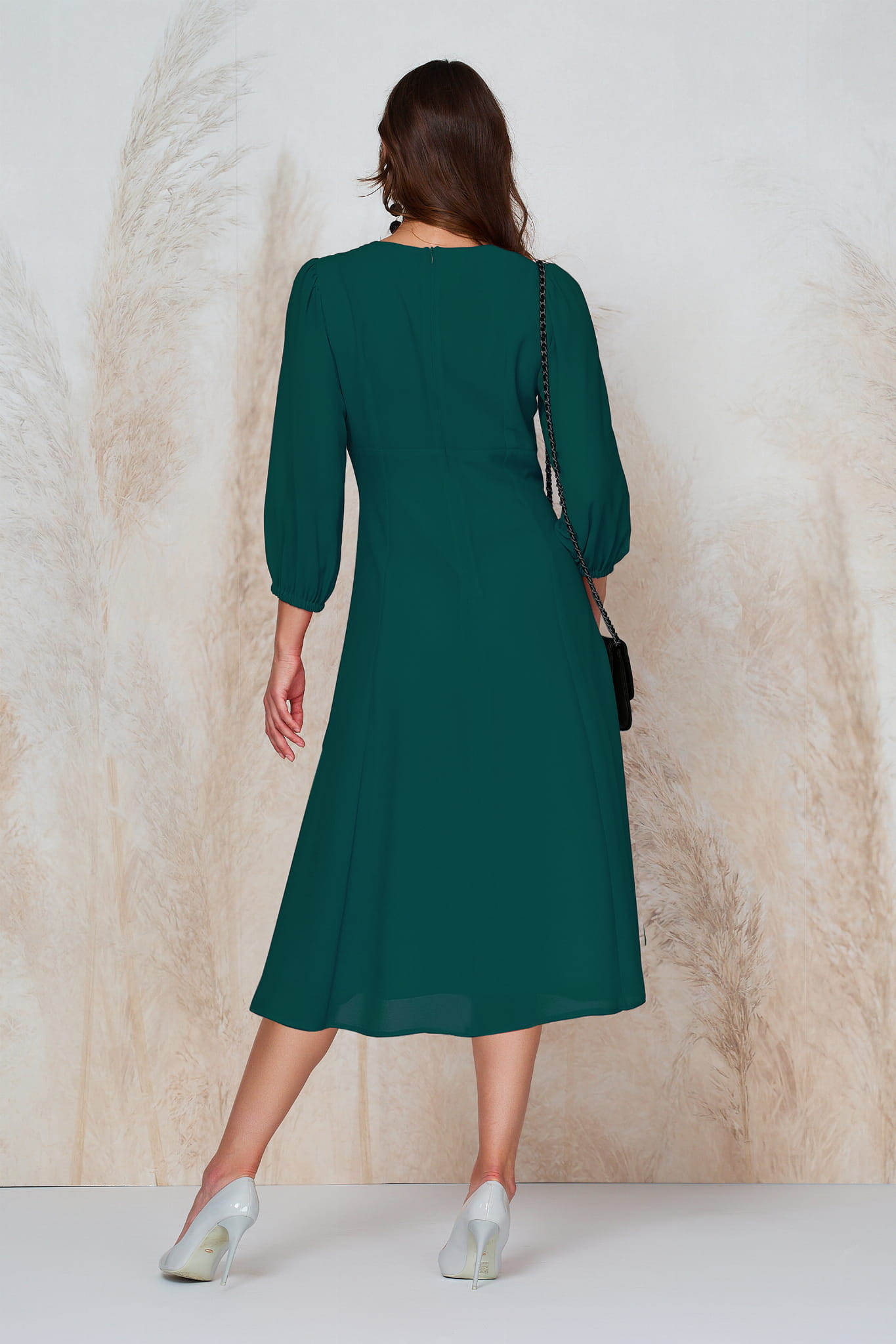 Sukienka Dorena w odcieniu głębokiej zieleni to idealna propozycja dla kobiet, które lubią łączyć klasykę z odrobiną świeżości. Delikatna tkanina pięknie układa się na sylwetce, a wiązanie przy dekolcie subtelnie podkreśla kobiecy urok. Dzięki długości midi i rękawom ¾ model sprawdzi się zarówno na co dzień, jak i na specjalne okazje.