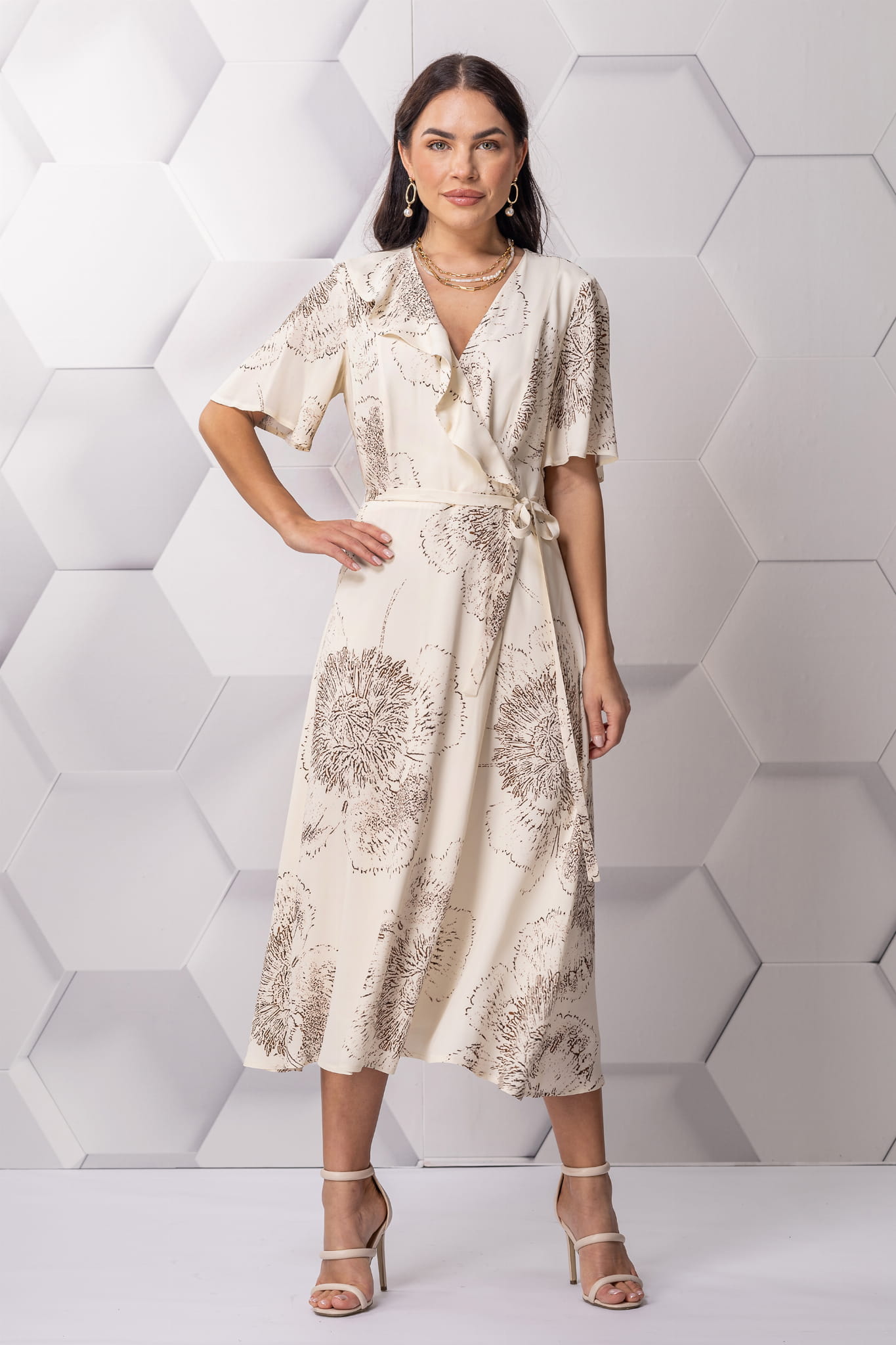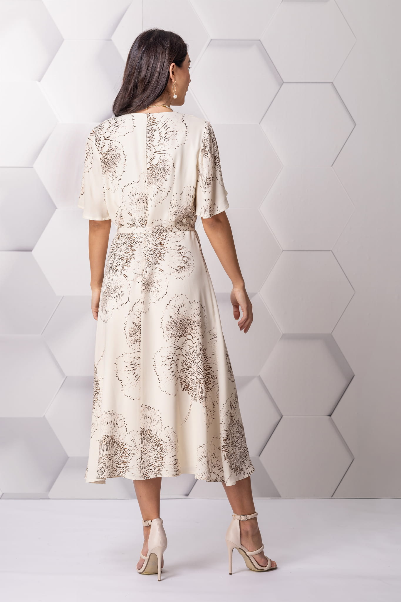 Oto sukienka, która zachwyca subtelną elegancją. Beżowa Montana to model, który idealnie łączy w sobie klasyczny szyk z kobiecym wdziękiem. Rysunkowy kwiatowy wzór, wiskoza i kopertowy fason sprawiają, że to idealna sukienka wizytowa na rodzinne uroczystości – komunię, chrzciny czy jubileusz. Długość midi z delikatnym rozcięciem oraz rękawy do łokcia dodają jej lekkości i sprawiają, że z łatwością dopasujesz ją do swojej sylwetki.