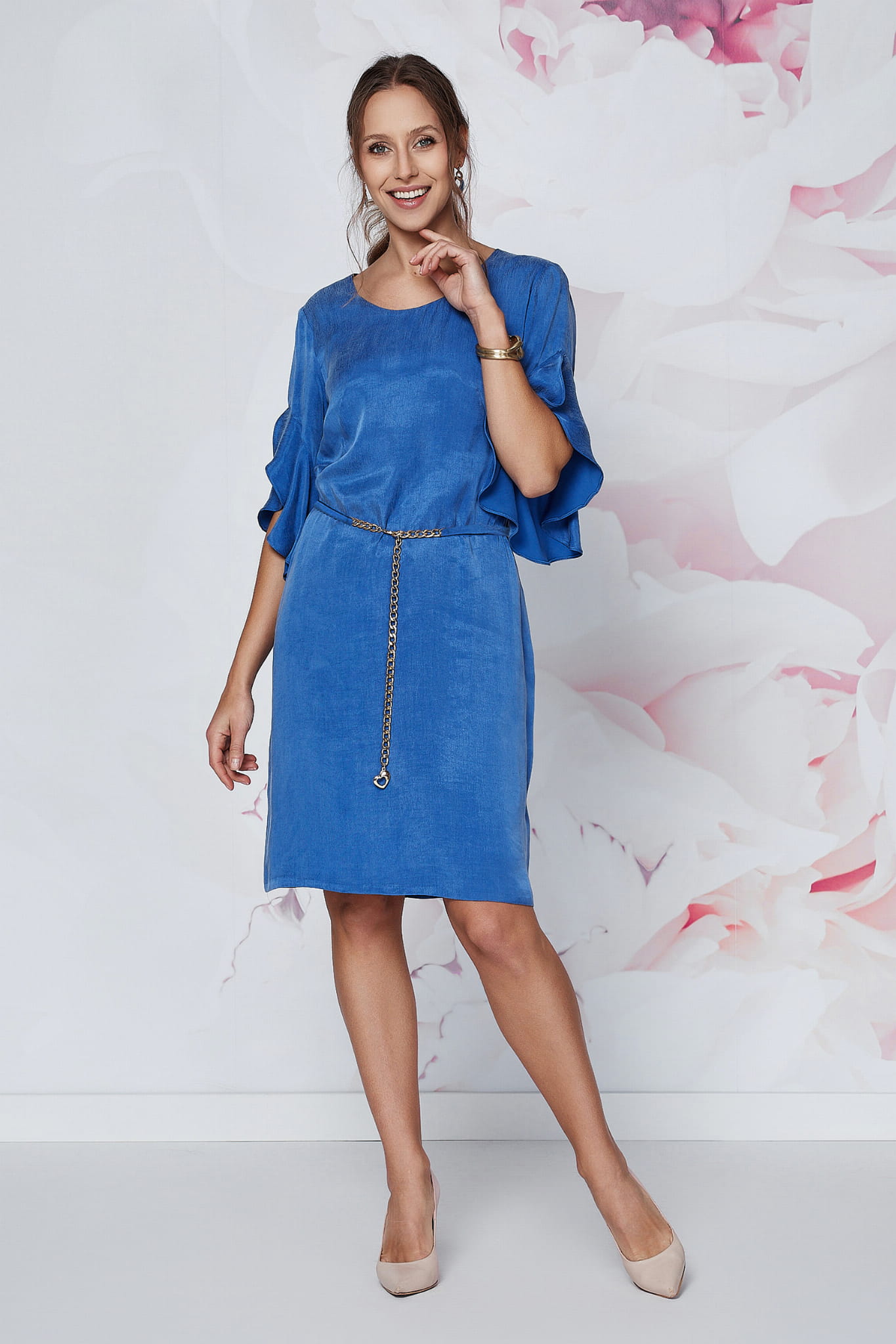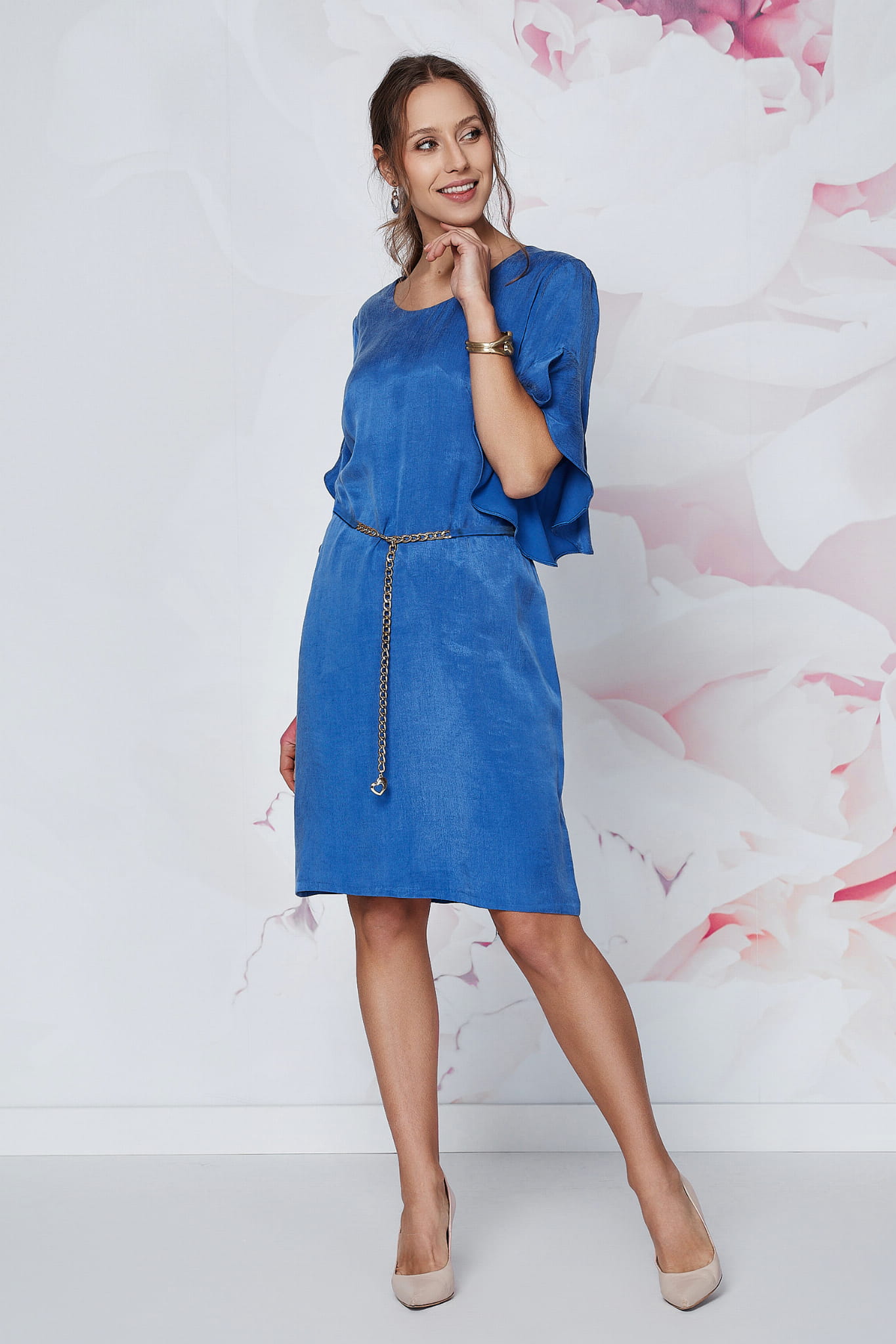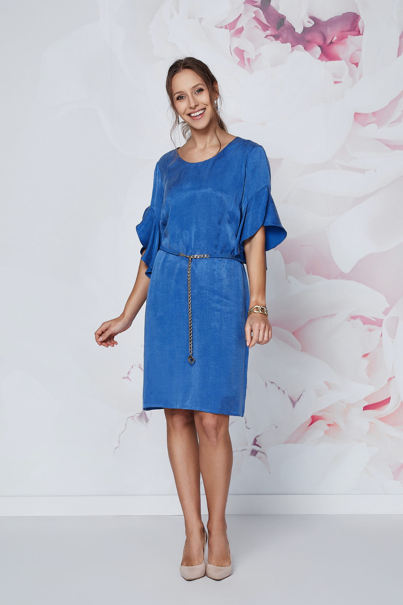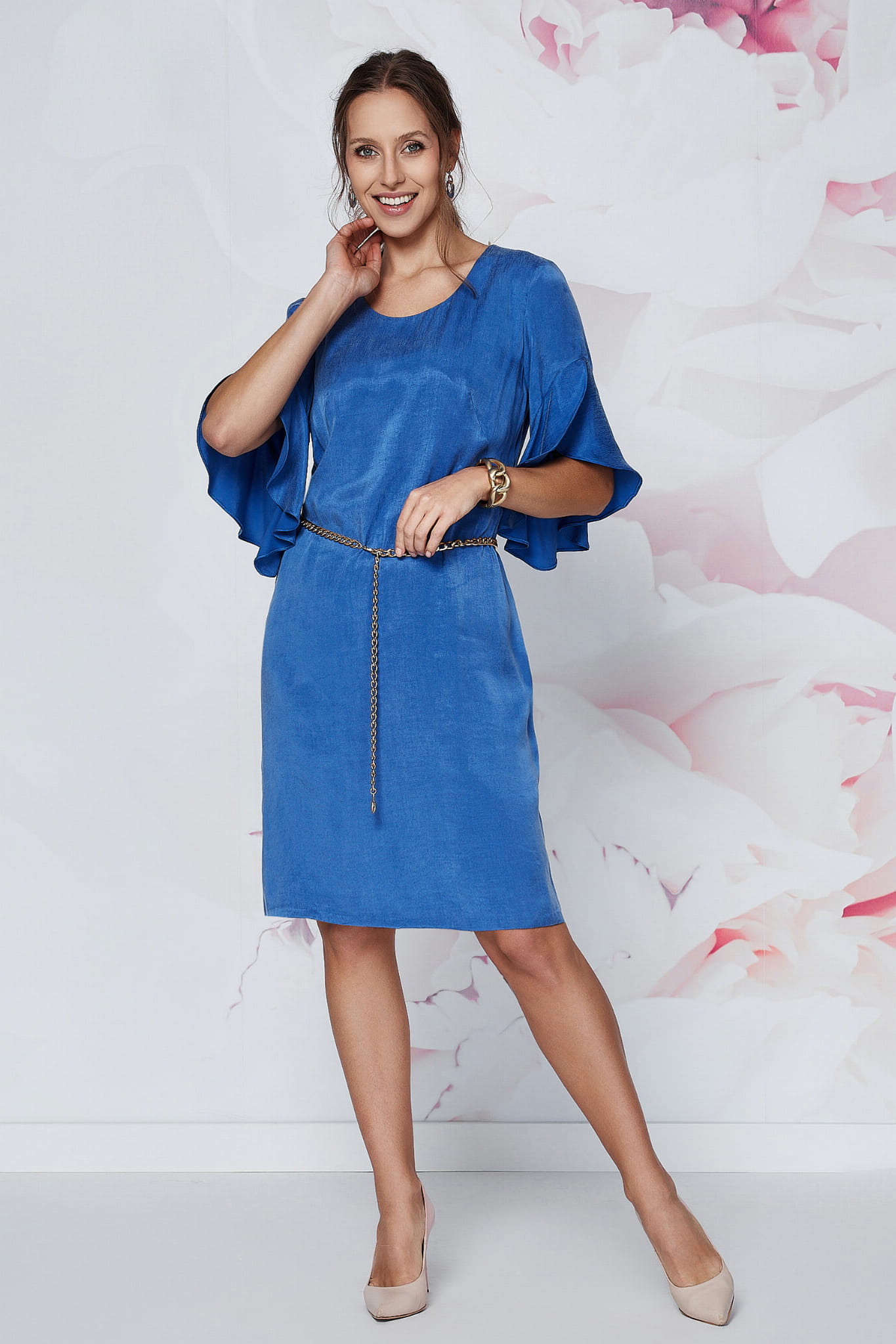 Kluczowym elementem Seleny są jej efektowne, kaskadowe rękawy. Dodają one stylizacji dynamiki i nowoczesnego sznytu, jednocześnie subtelnie maskując ramiona. Prosty, lekko dopasowany krój . Dzięki dołaczonemu do sukienki paskowi z łąńcuszkiem lekko zaakcentujesz talię.