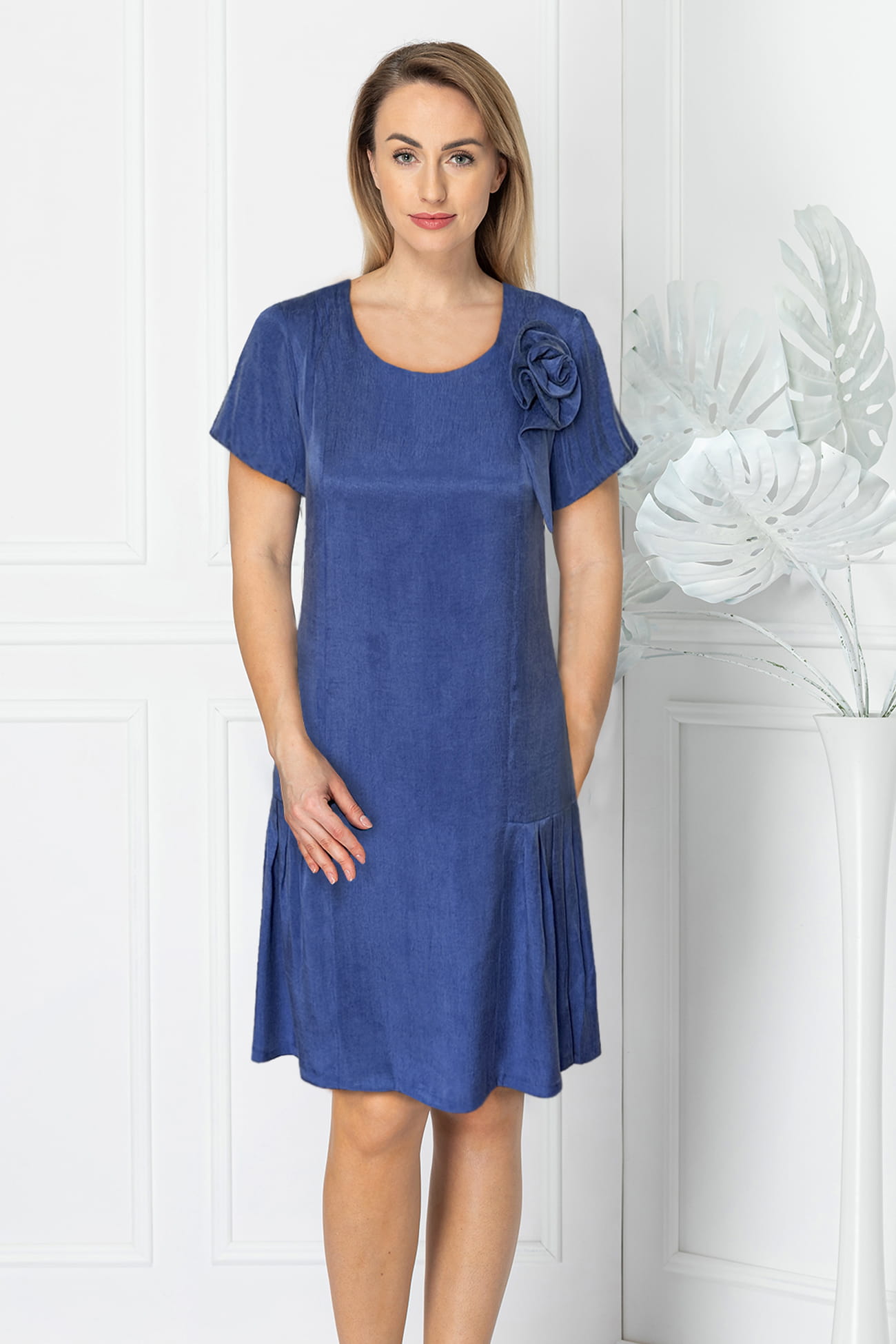Subtelna i elegancka – sukienka Zaria w odcieniu głębokiego niebieskiego to doskonały wybór na wyjątkowe okazje. Uszyta z lyocellu, który zachwyca miękkością, lekkością i pięknym układaniem się na sylwetce, zapewnia nie tylko estetykę, ale i komfort noszenia. Prosty, lekko rozkloszowany krój z delikatnym marszczeniem na dole oraz krótkimi rękawkami tworzy harmonijną, kobiecą całość. Ozdobna aplikacja w formie materiałowego kwiatu na ramieniu dodaje oryginalności i wyrafinowanego detalu. Sukienka Zaria sprawdzi się idealnie jako sukienka wizytowa, kreacja na wesele lub elegancki strój na rodzinne uroczystości. Dzięki swojej długości do kolan i swobodnemu fasonowi pięknie układa się na różnych typach sylwetek. To propozycja, która łączy klasykę z odrobiną romantyzmu.