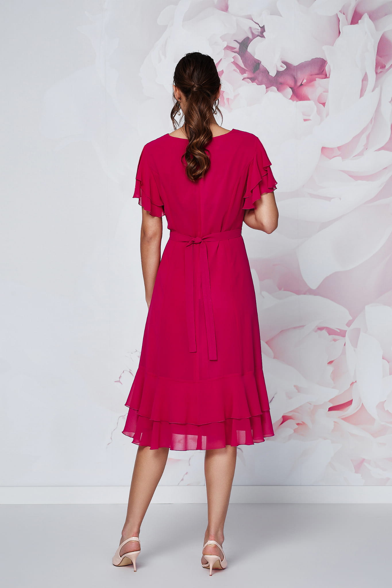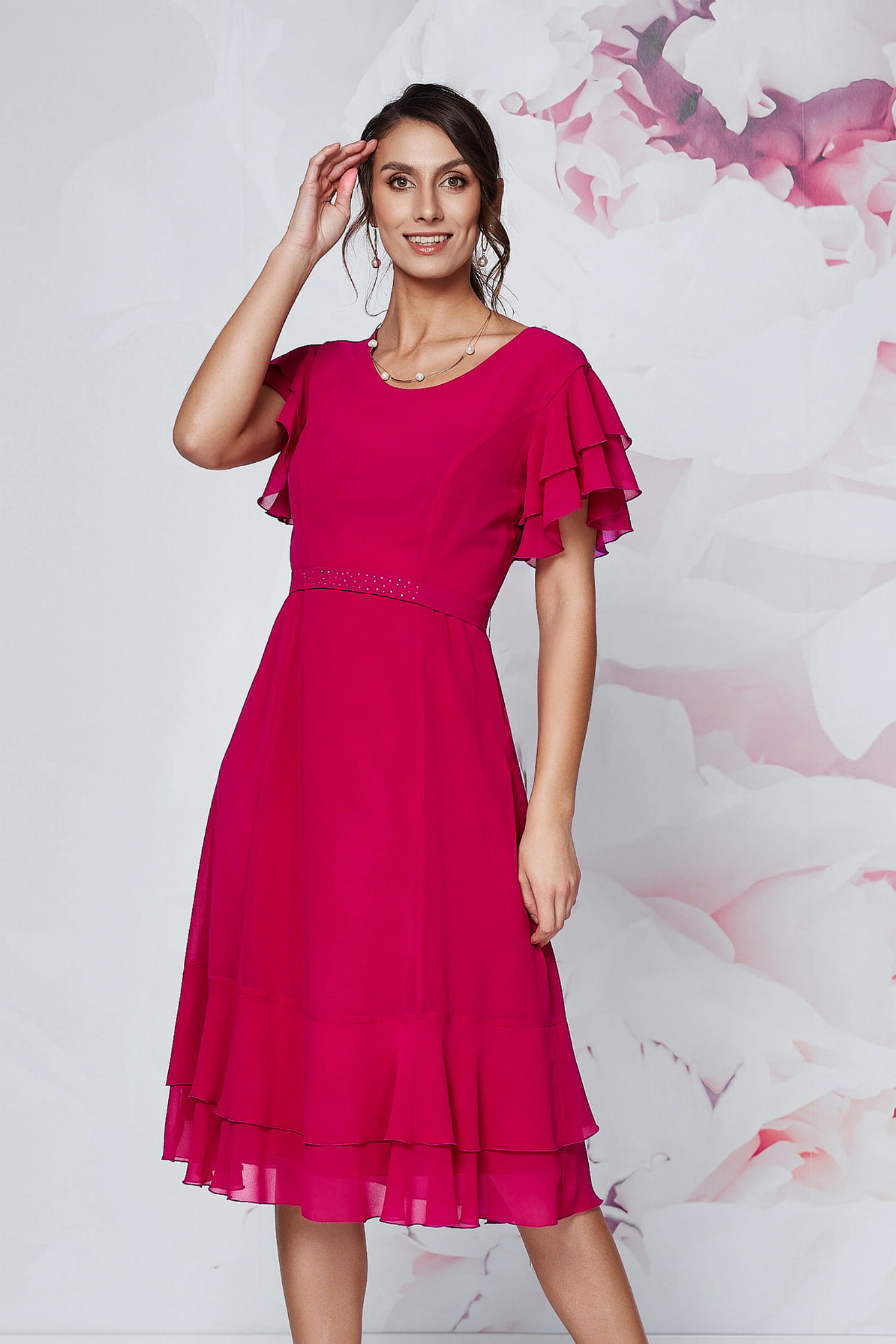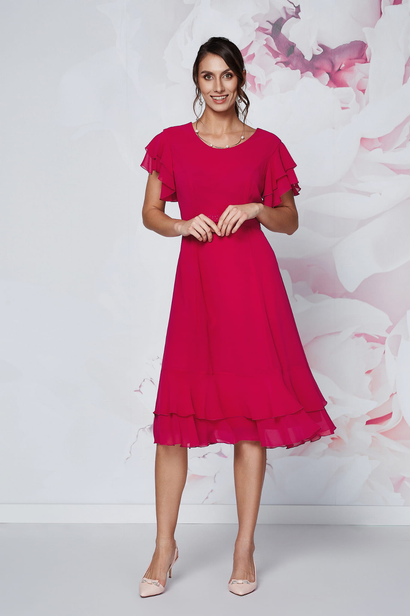 Sukienka charakteryzuje się niezwykle kobiecym, warstwowym krojem. Zwiewny szyfon nadaje całości eterycznego charakteru, a potrójne falbanki na rękawach oraz subtelne falbany na dole spódnicy sprawiają, że każdy Twój krok nabiera lekkości. Kluczowym elementem konstrukcji jest pasek ozdobiony rzędami drobnych dżetów, który nie tylko pięknie lśni, ale przede wszystkim perfekcyjnie zaznacza talię, tworząc harmonijną sylwetkę. To idealny wybór dla pań, które chcą poczuć się smukło i komfortowo.