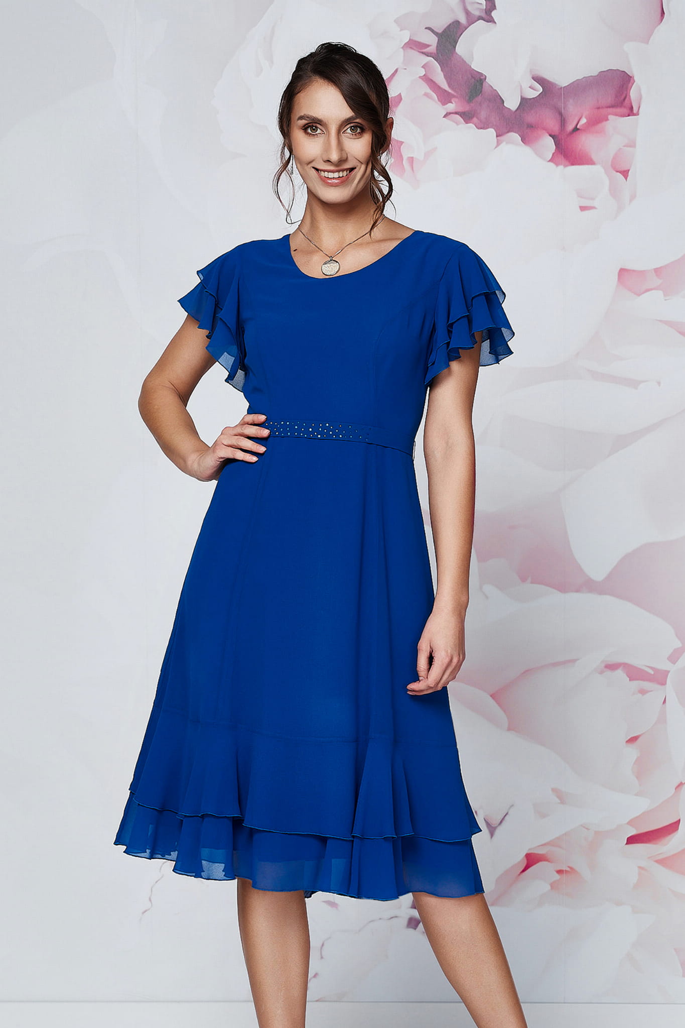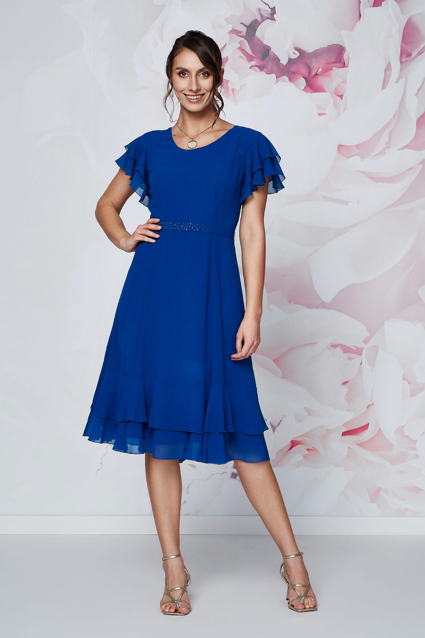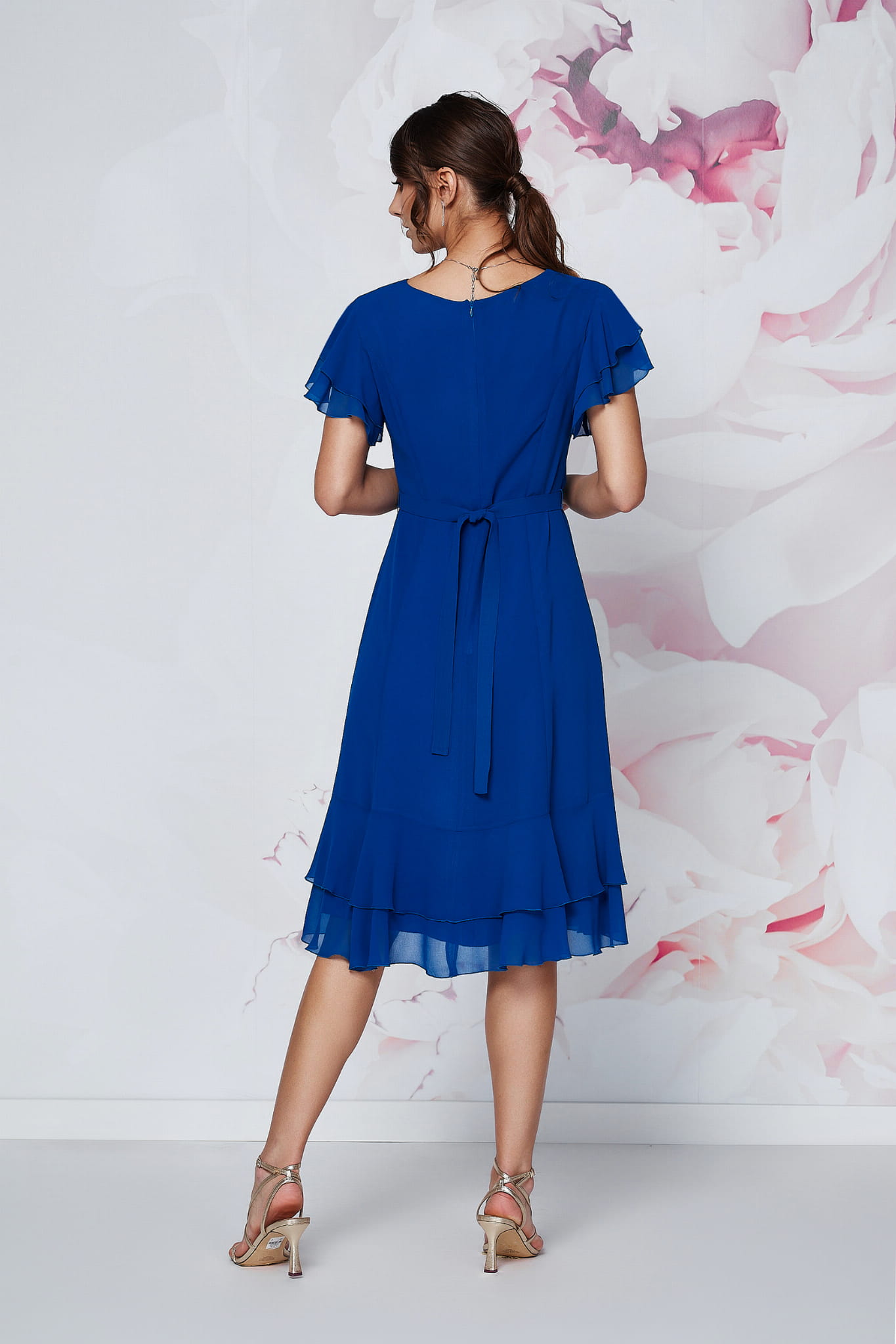 Sukienka Batumi zachwyca finezyjnym połączeniem lekkiego szyfonu z niezwykle kobiecym krojem. Największym atutem modelu są zwiewne, kaskadowe falbanki przy rękawach, które dodają sylwetce dynamiki i subtelnie maskują ramiona. Odcięcie w talii, podkreślone eleganckim paskiem z delikatnymi dżetami, tworzy pożądany kształt klepsydry, zapewniając jednocześnie swobodę w dolnych partiach ciała. Warstwowy dół sukienki pięknie układa się podczas ruchu, co czyni ją idealnym wyborem dla kobiet ceniących sobie wdzięk i lekkość.