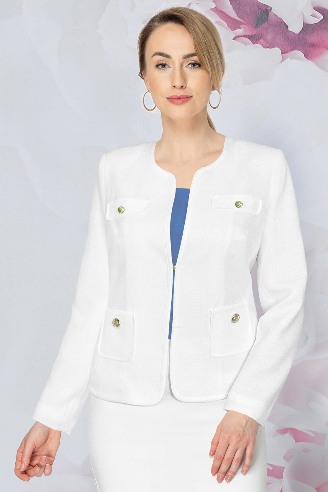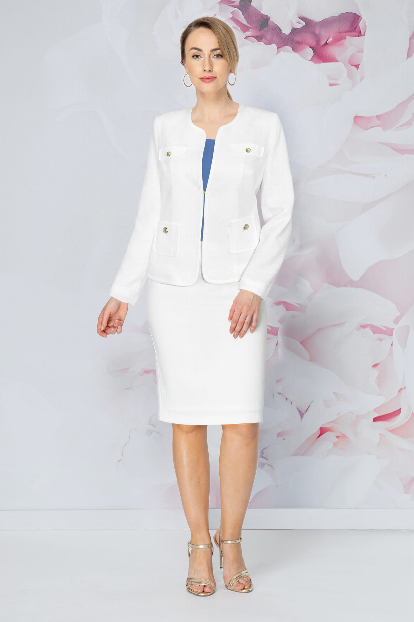 Żakiet Zahira został zaprojektowana tak, by służyć Ci przez lata. Jego pudełkowy fason bez kołnierza pięknie eksponuje linię ramion i szyi, a biżuteryjne guziki na ozdobnych patkach dodają całości prestiżowego sznytu. To idealny wybór dla kobiet, które szukają ubrań z charakterem. Żakiet fantastycznie komponuje się z białą spódnicą Zahira, tworząc luksusowy kostium, ale równie dobrze prezentuje się narzucony na sukienkę z tej samej linii, tworząc biały total look.