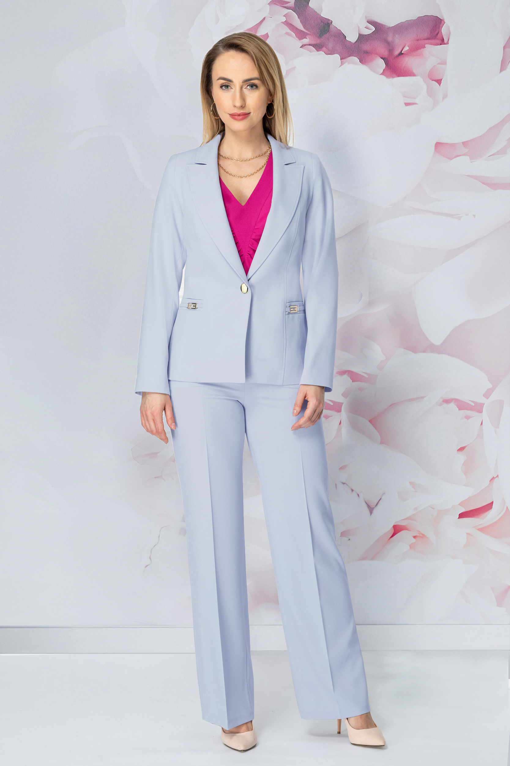 Błękitny żakiet Korso to propozycja dla kobiet, które cenią sobie klasykę w nowoczesnym, kolorystycznym wydaniu. Jego uniwersalność sprawia, że jest to jeden z tych elementów garderoby, który „ratuje” każdą stylizację, nadając jej szlachetnego wyrazu. Niezależnie od tego, czy założysz go do pracy, czy na rodzinną uroczystość – błękitny Korso zawsze będzie symbolem dobrego stylu. Rzem ze spodniami z tej samej tkaniny zyskasz w szafie idealny, perfekcyjny garnitur na każdą o okazję.